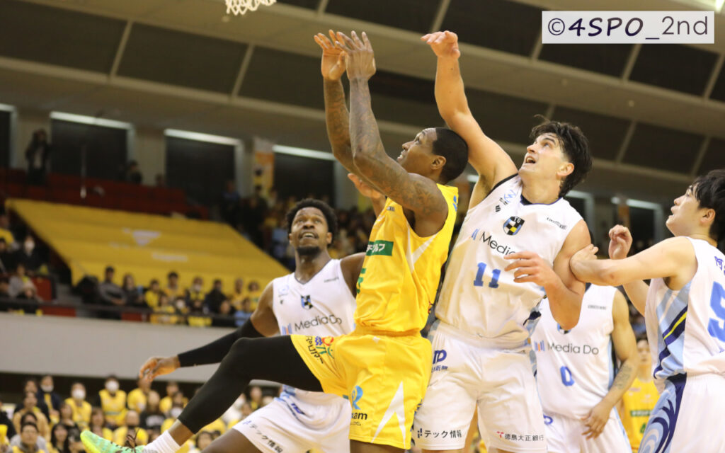 (徳島:ドーソン選手 15得点6リバウンド3アシスト 、森山選手 14得点2リバウンド1アシスト1スティール 、ローガン選手 7得点5リバウンド4アシスト1スティール )